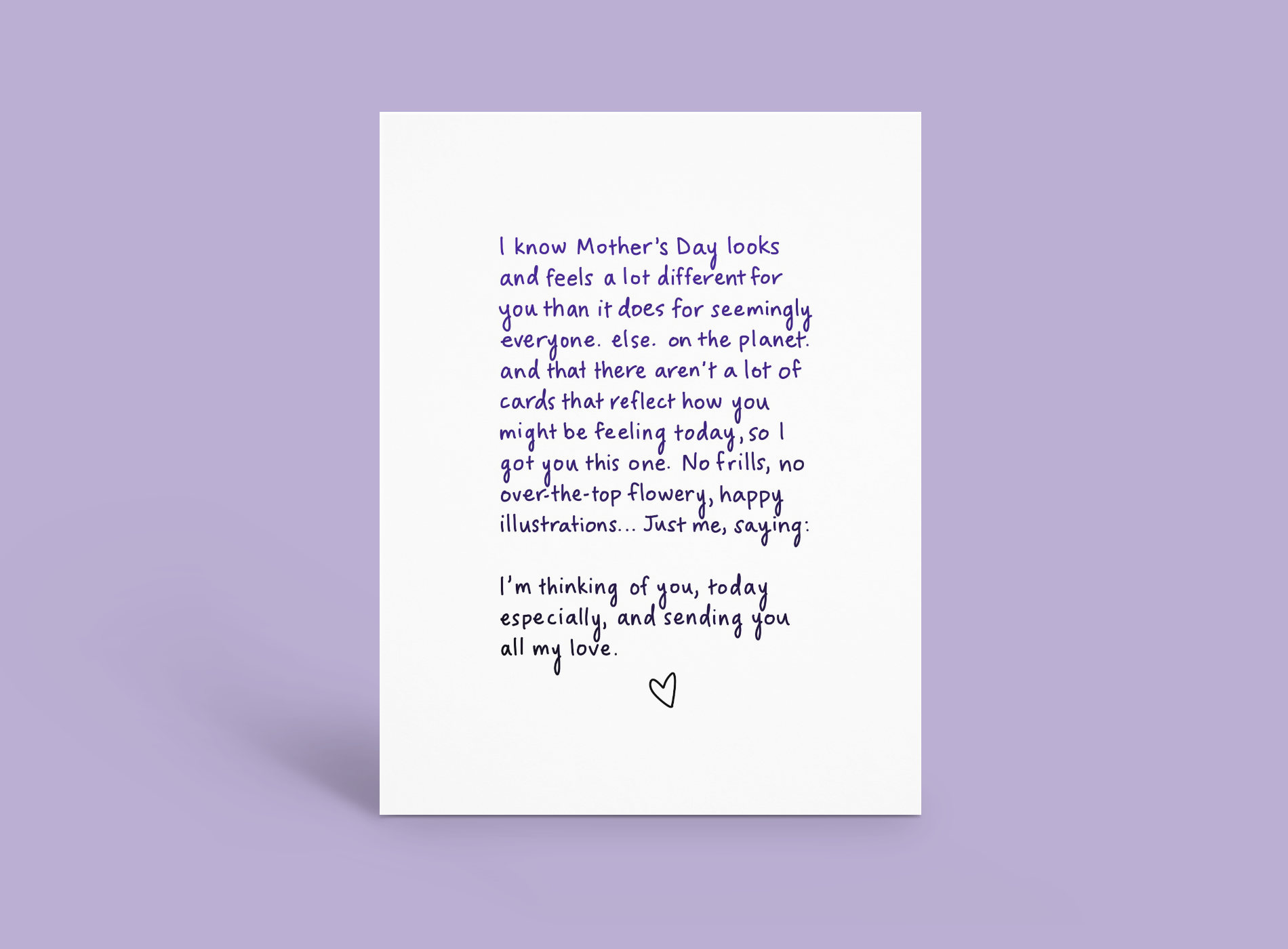 “I know Mother's Day looks and feels a lot different for you than seemingly everyone. else. on the planet. and that there aren't a lot of cards that reflect how you might be feeling today, so I got you this one. No frills, no over-the-top flowery, happy illustrations... Just me, saying: I'm thinking of you, today especially, and sending you all my love.”