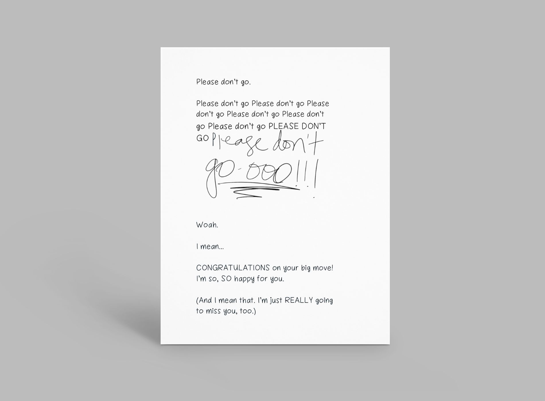 Here's the card that will help you spill your wackadoo-guts to the person leaving you physically, although never mentally, spiritually, or digitally-because-you-call-and-text-and-DM-eachother-all-the-time. Let them know exactly how much they mean to you as you give them a loving send off.