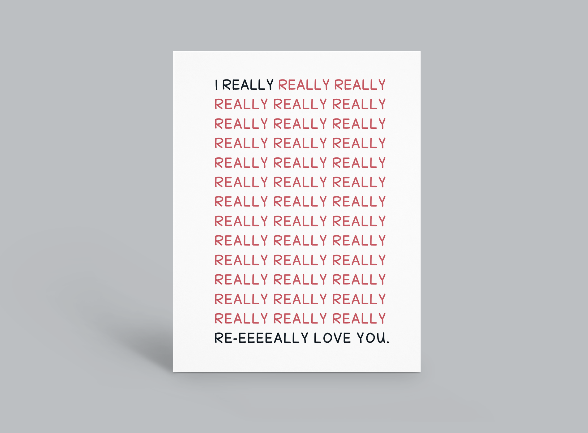 I'm not one for mushy Valentine's Day cards that seem to poetically confess our love for our favorite people, and I'm guessing if you're here, you're not either. Which is why I designed this one – because it reads just like we sound, when telling someone how much we love them: plainly and simply. Also enthusiastically.
