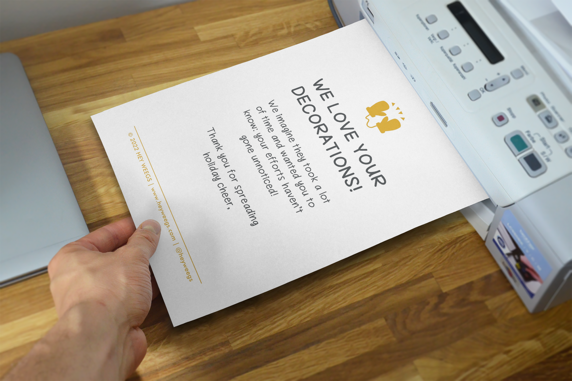 Recognize your neighbors' effort in spreading holiday cheer with their awesome decorations! Simply print, sign, and deliver. You can also encourage your little one to make it their own.