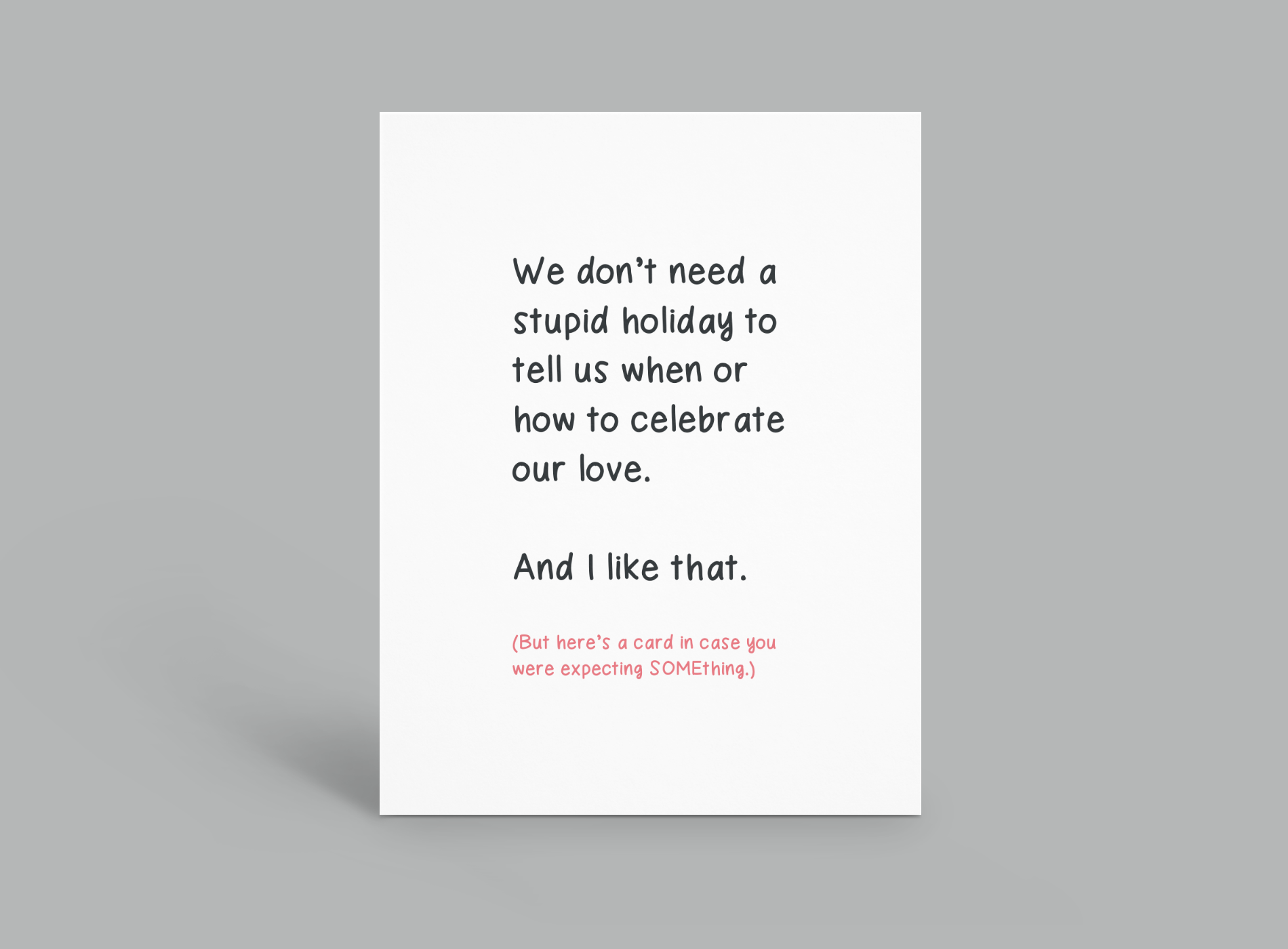 "We don't need a stupid holiday to tell us when or how to celebrate our love. And I like that.