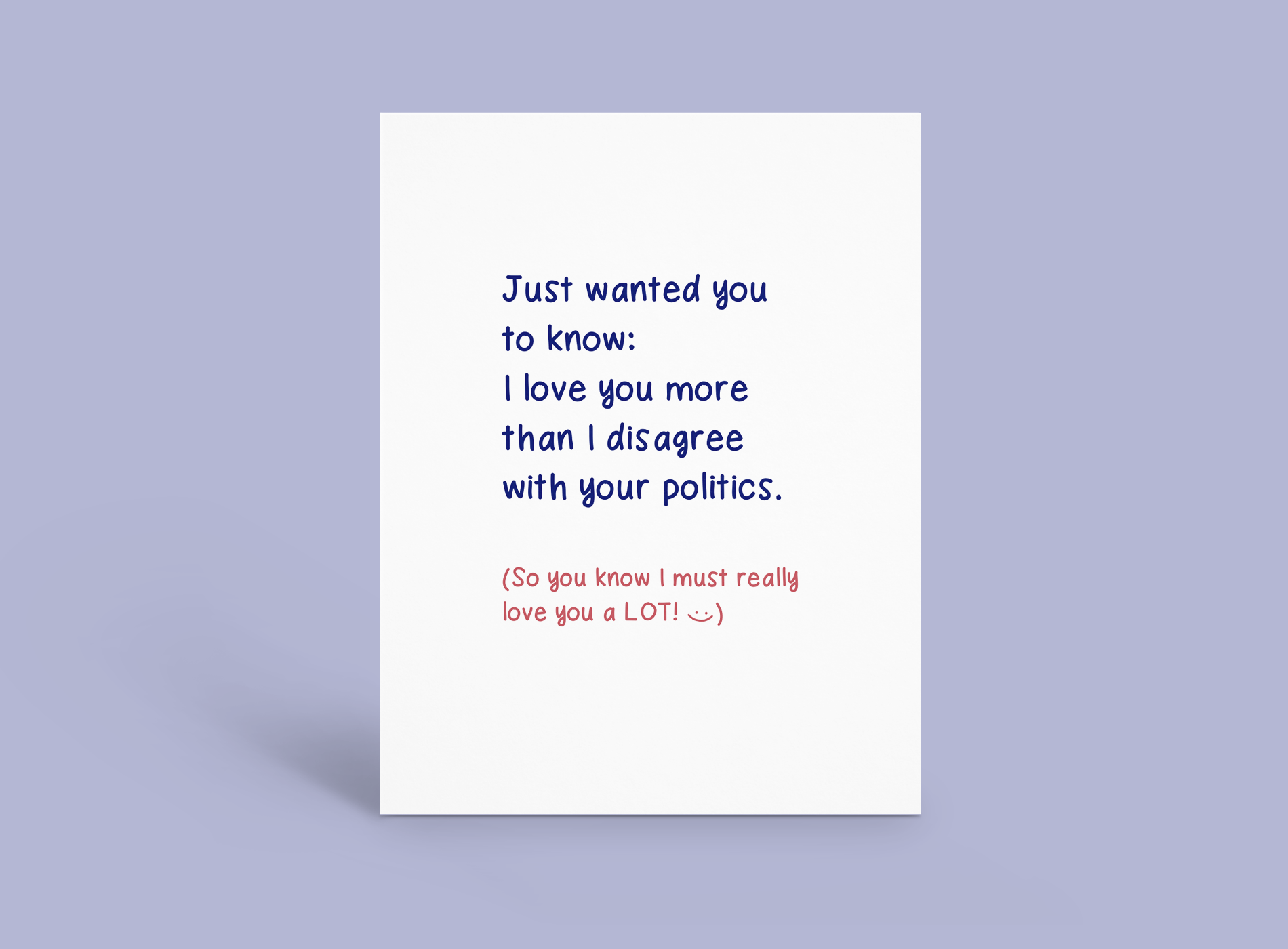 "Just wanted you to know: I love you more than I disagree with your politics. (So you know I must really love you a LOT. :) )" This card was created to help you address the elephant (and donkey) in the room gently and with a sense of humor, so you can mend and maintain an important relationship.