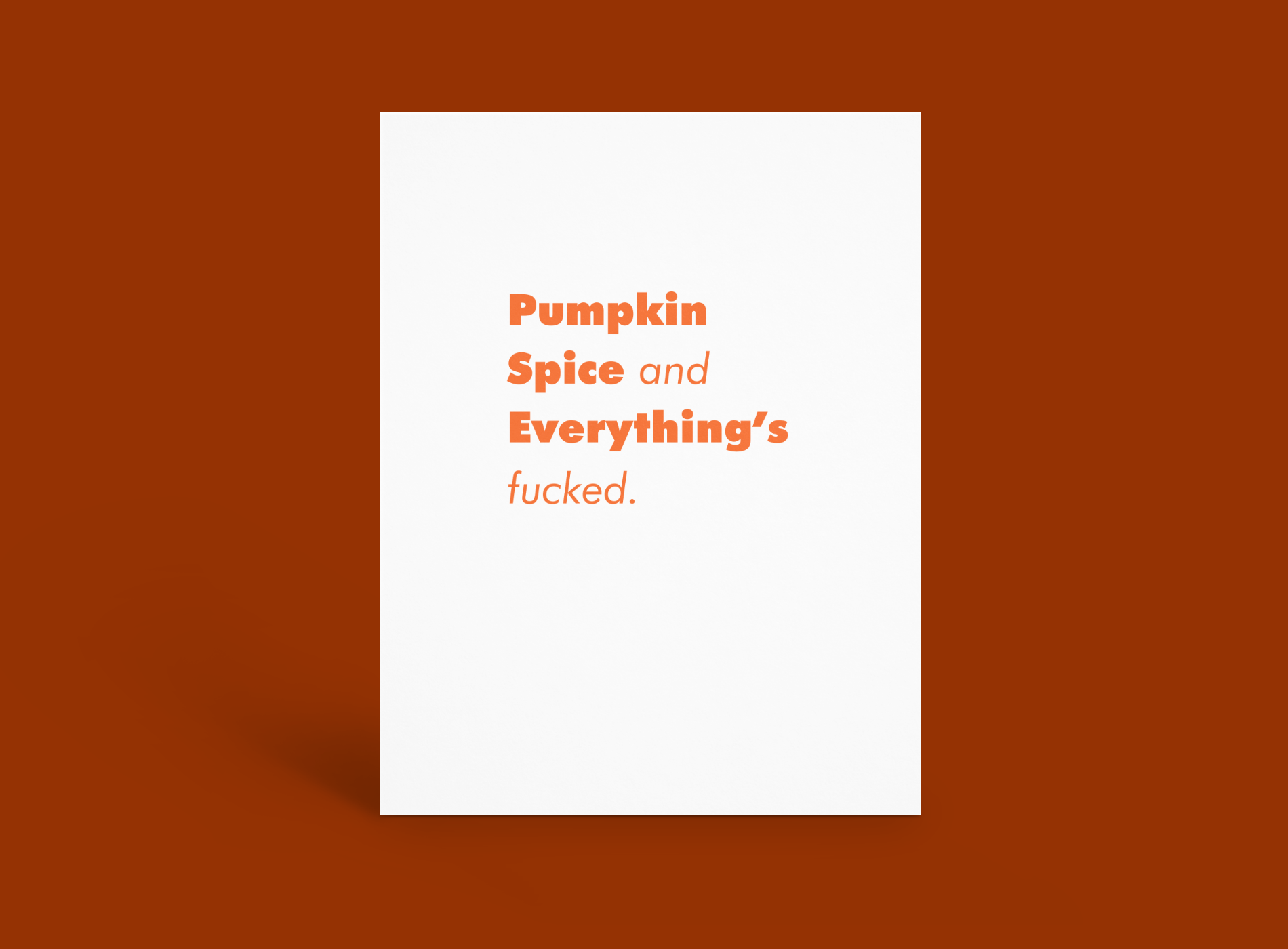 Nothing embraces the Fall of this year for some of us, quite like, “Pumpkin spice and everything’s fucked.” Another card my dad disapproves of. 😬 Great for Halloween, Thanksgiving, or anytime your blunt friend could use a laugh. Hopefully.