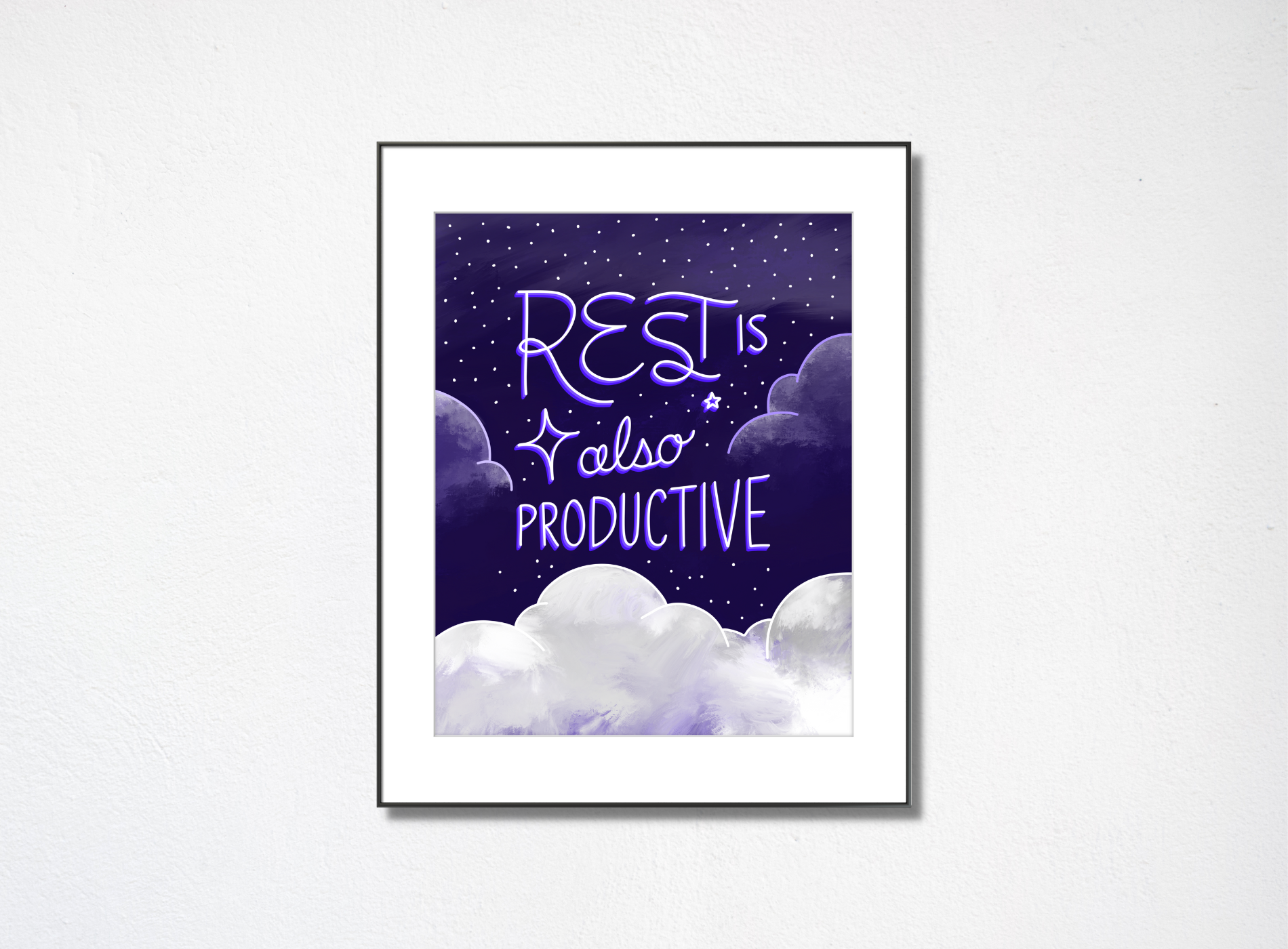"Rest is also productive" My therapist said this to me years ago in a time when our culture of hyper-productivity was getting the best of me. And it stuck. Let this print be a gentle reminder that rest is not only okay, but absolutely necessary.