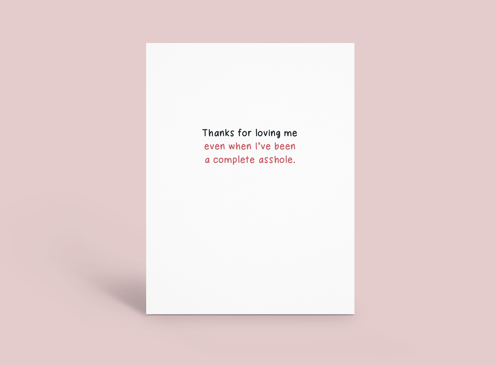 "Thanks for loving me even when I've been a complete asshole." Another card that keeps it very real. Works on Valentine's Day or any day. Works especially well as an apology card!