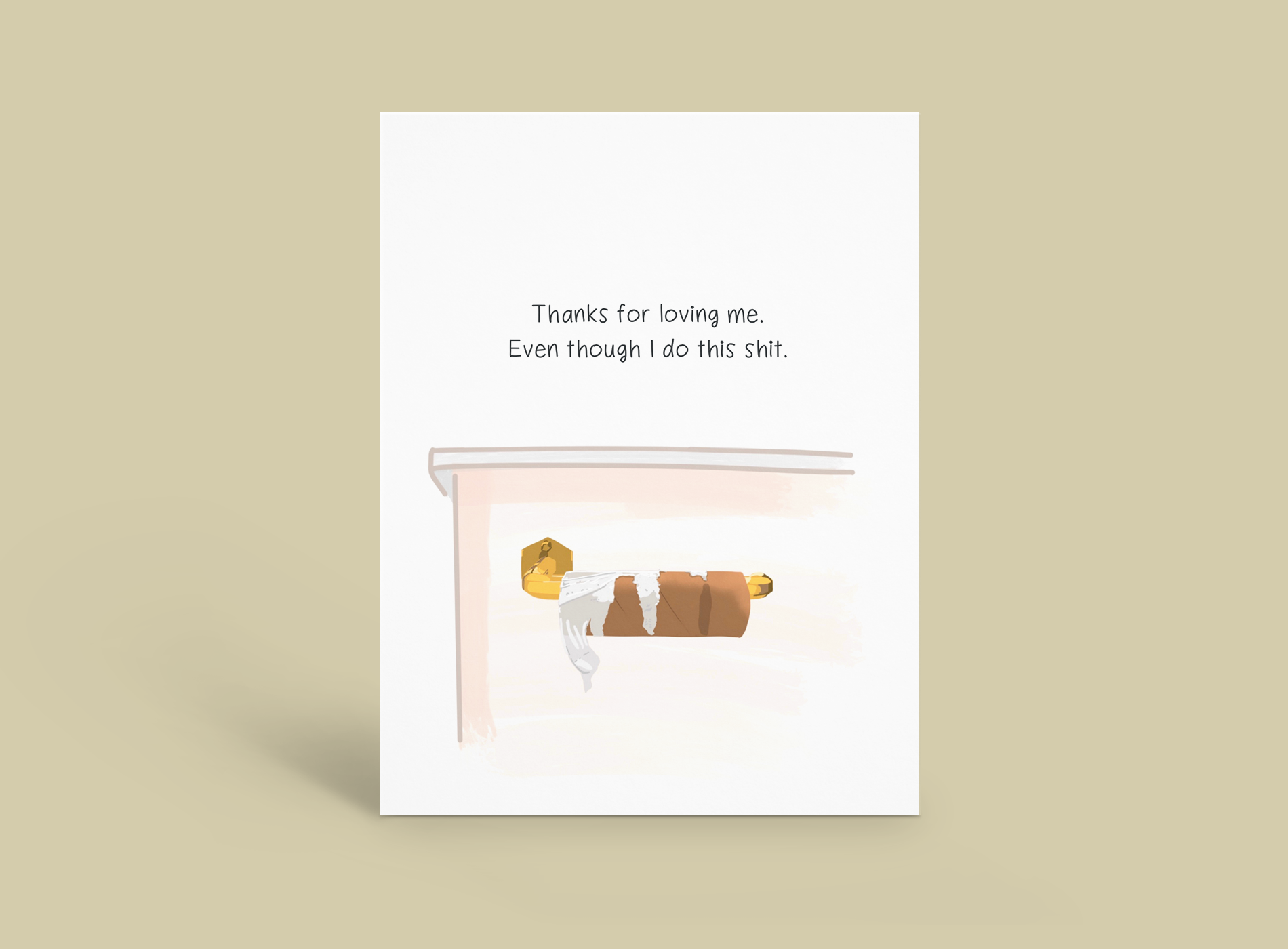 "Thanks for loving me. Even though I do this shit." With the empty toilet paper roll left unchanged for someone else to refill.